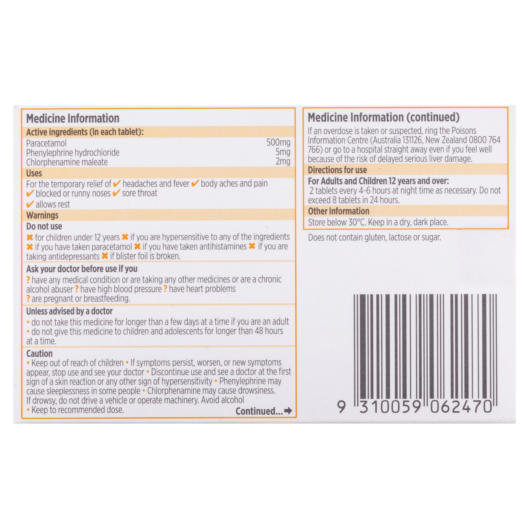 Codral Cold & Flu + Mucus Cough is for temporary relief of headaches, blocked or runny noses, fever, body aches and pain, sore throat and chesty cough.