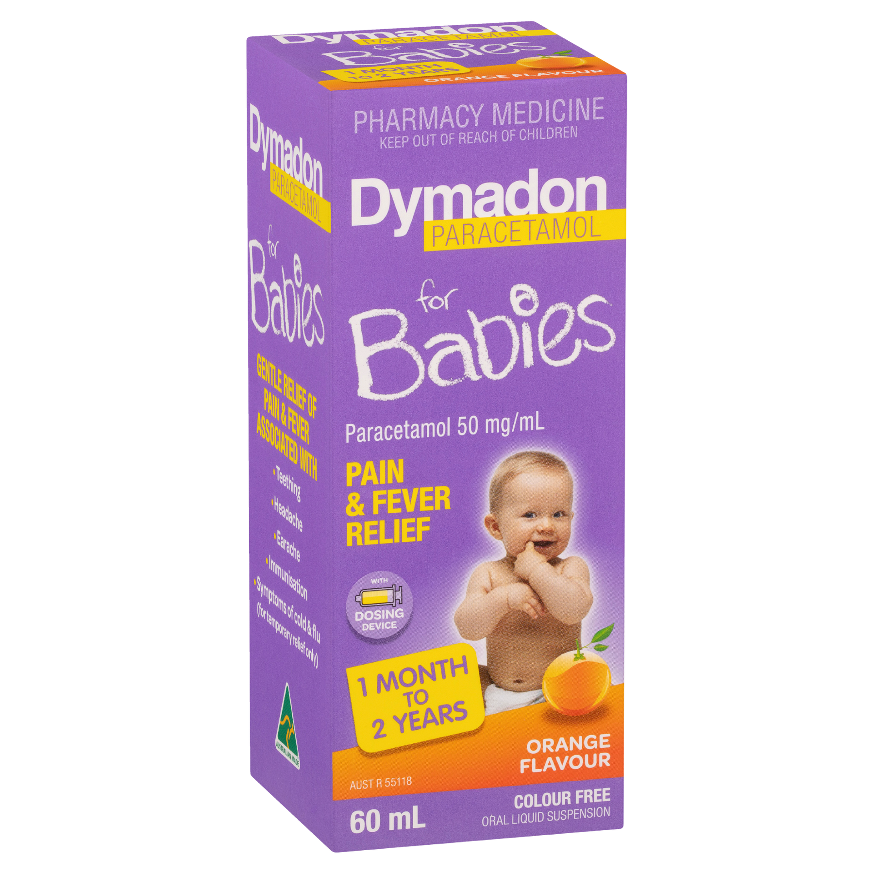 Dymadon for Babies comes in great-tasting orange or strawberry flavour, colour-free oral liquid suspension formulated for babies aged between 1 month and 2 years.