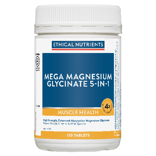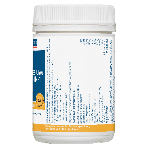 MEGA MAGNESIUM GLYCINATE 5-IN-1 combines exclusive MagActive® – a high potency, enhanced absorption magnesium glycinate - with Zinc, Vitamin B6, Chromium & Selenium. These 5 nutrients work together to deliver 5 key benefits:
