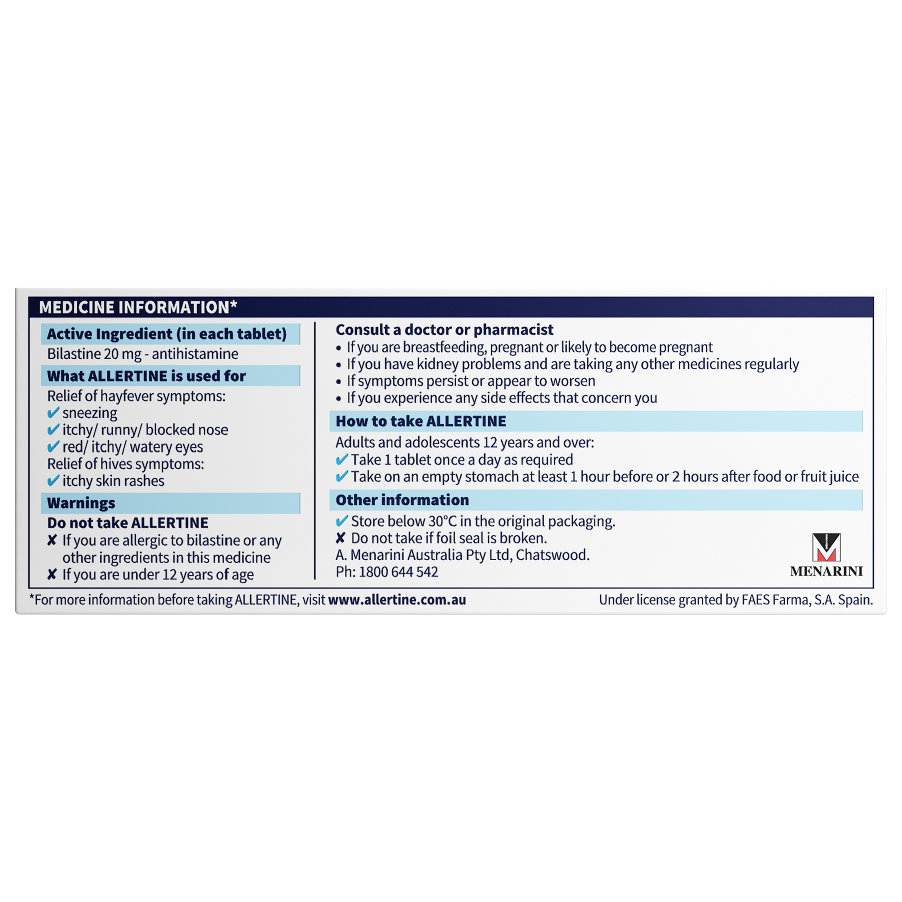 Do not take Allertine: · If you are allergic to bilastine or any other ingredients in this medicine · If you are under 12 years of age · Consult a doctor or pharmacist: · If you are breastfeeding, pregnant or likely to become pregnant · If symptoms persist or appear to worsen · If you experience any side effects that concern you. Do not use this medicine after the expiry date.