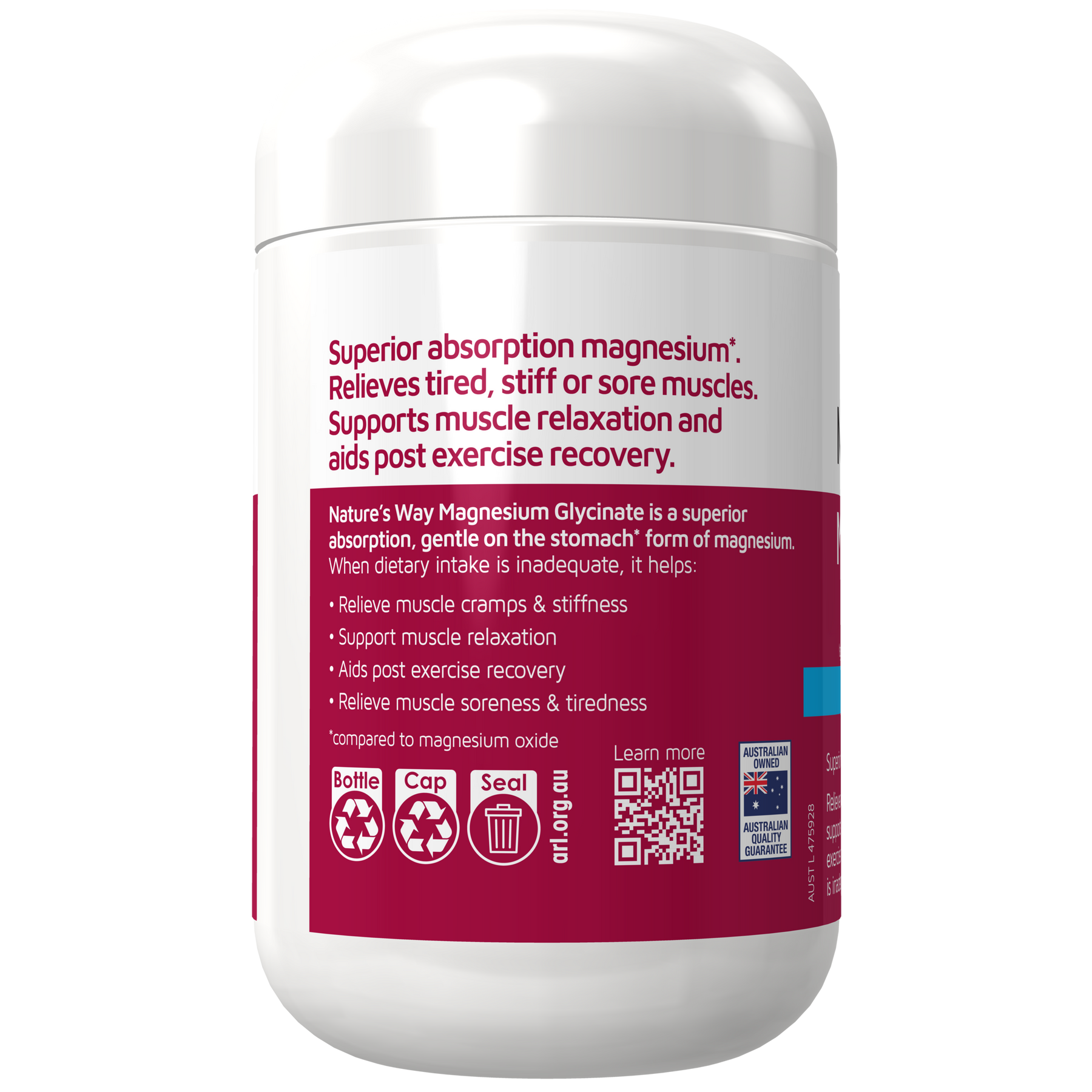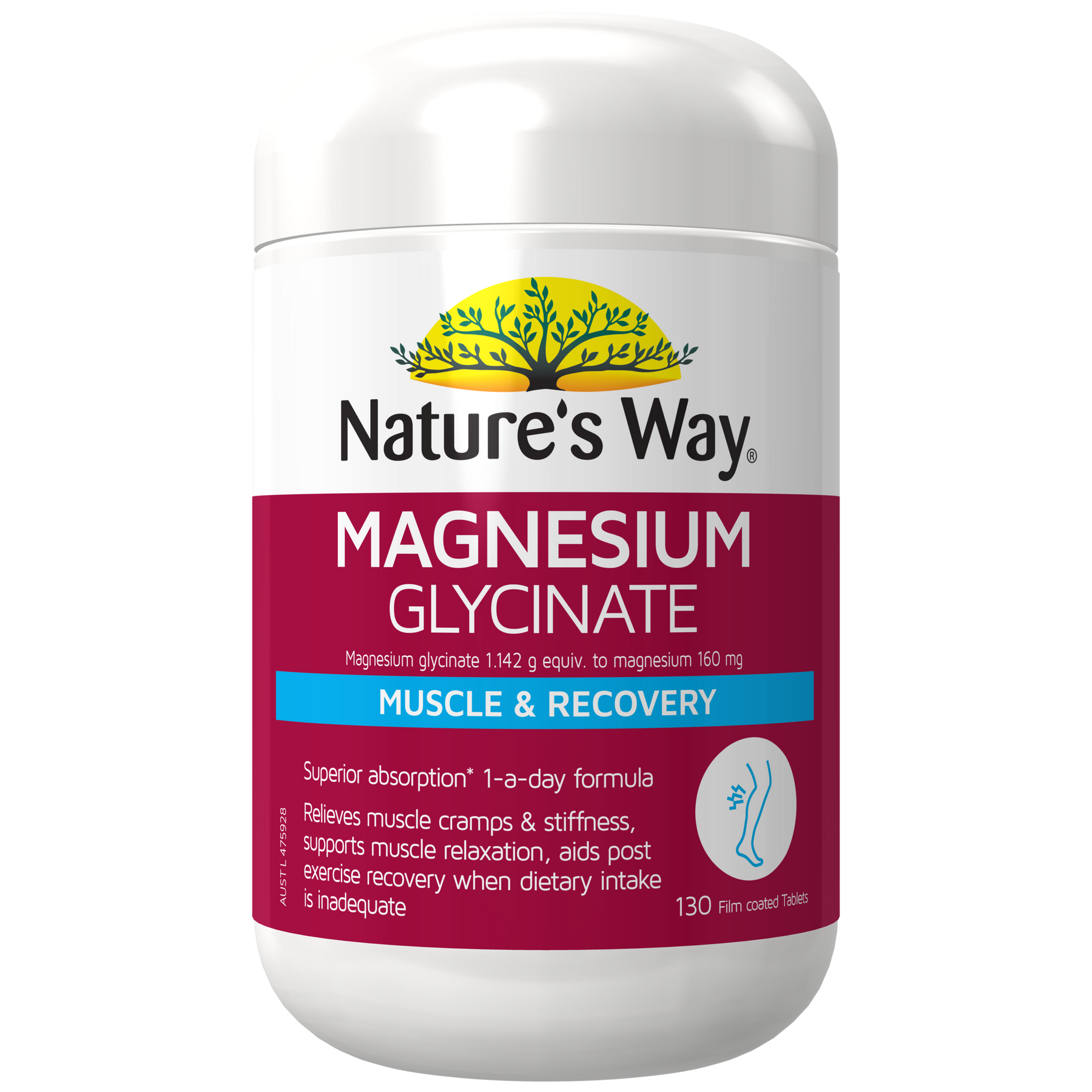 Nature's Way Magnesium Glycinate 130 tablets, only one a day to support muscle relaxation. Relieves tired, stiff, and sore muscles, and aids post-exercise recovery when dietary intake is inadequate.