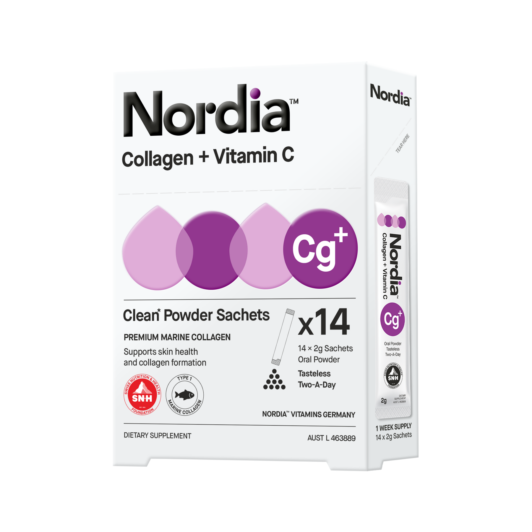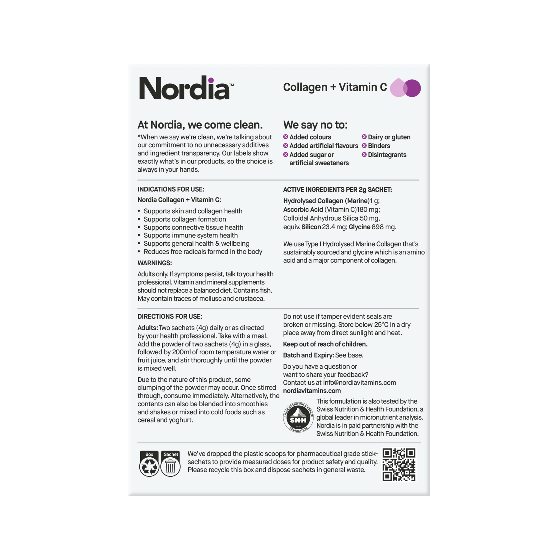 Nordia Collagen + Vitamin C is a tasteless, two-a-day formula clean label containing premium marine collagen, vitamin C and silicon to support skin health and collagen formation. Take two sachets daily in water, juice, a smoothie, or your favourite food, or as directed by your health professional.