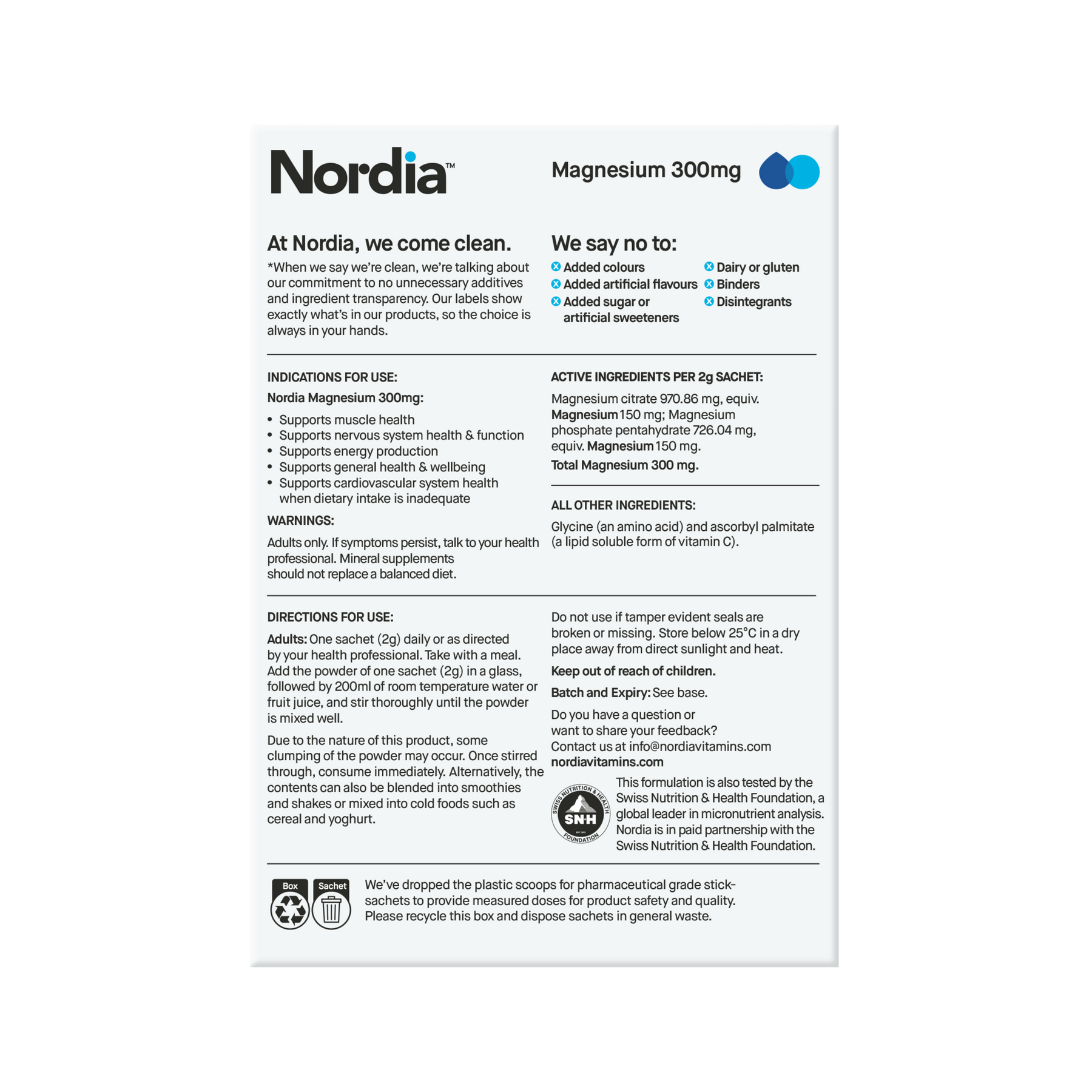Nordia Magnesium 300mg is an unflavoured, one-a-day clean label formula containing a high-strength dose of magnesium to support muscle health and nervous system function. Take one sachet daily in water, juice, a smoothie, or your favourite food, or as directed by your health professional.