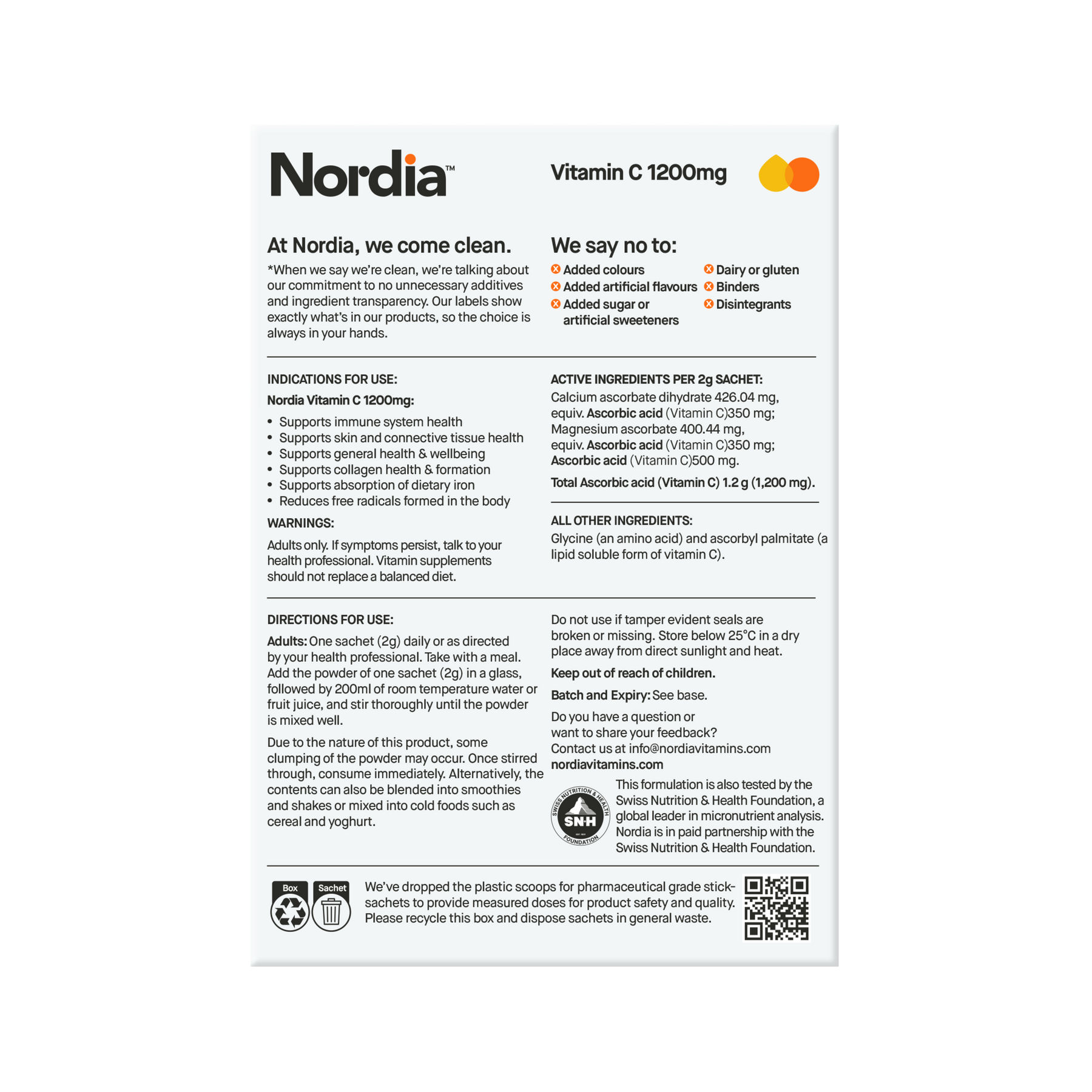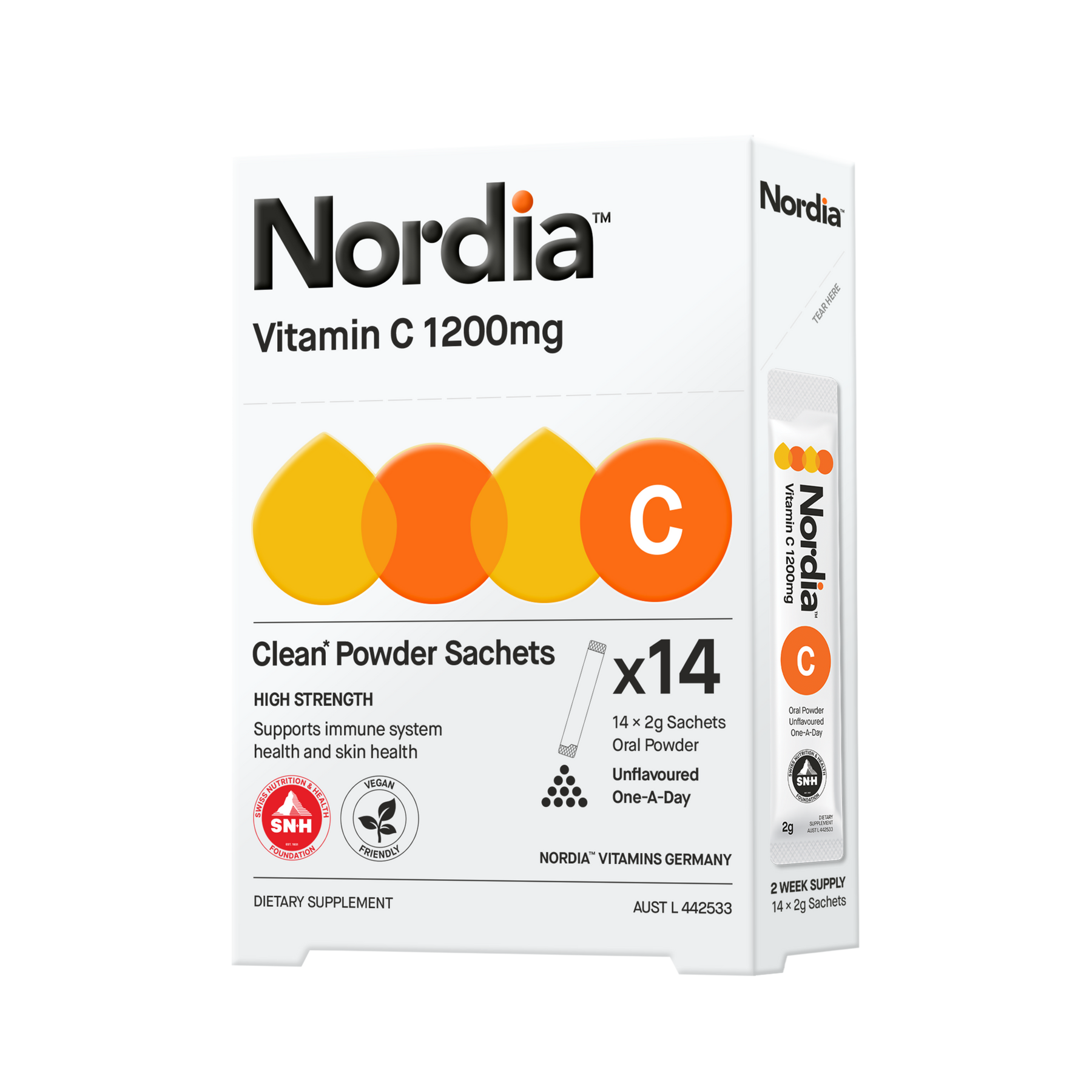 Nordia Vitamin C 1200mg is an unflavoured, one-a-day, clean label formula containing a high-strength dose of vitamin c to support immune system health and skin health. Take one sachet daily in water, juice, a smoothie, or your favourite food, or as directed by your health professional.ice, a smoothie, or your favourite food, or as directed by your health professional.
