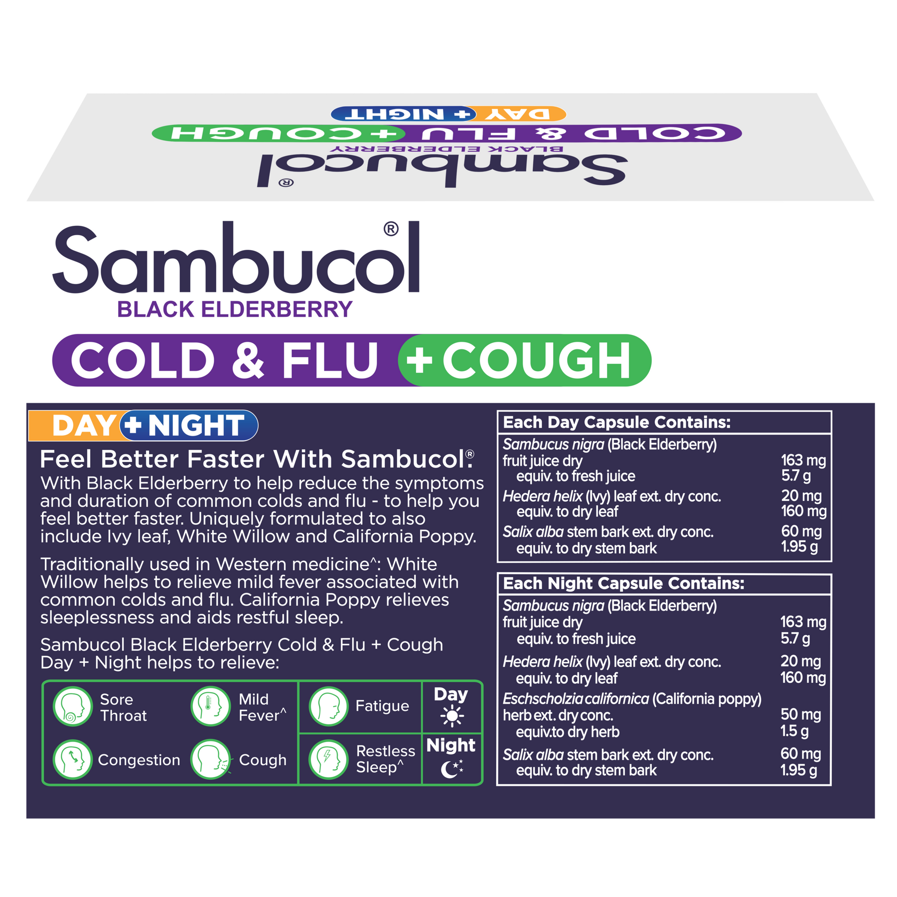 Feel Better Faster with Sambucol®. Sambucol Cold & Flu + Cough Day + Night 24 Capsules with Black Elderberry to help reduce the symptoms and duration of common colds and flu - to help you feel better faster. Uniquely formulated too also include Ivy leaf, White Willow and California Poppy.
